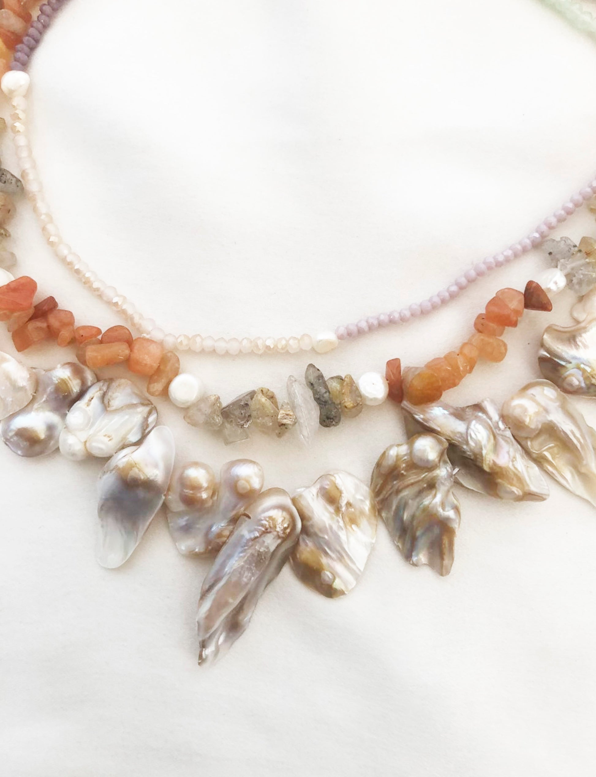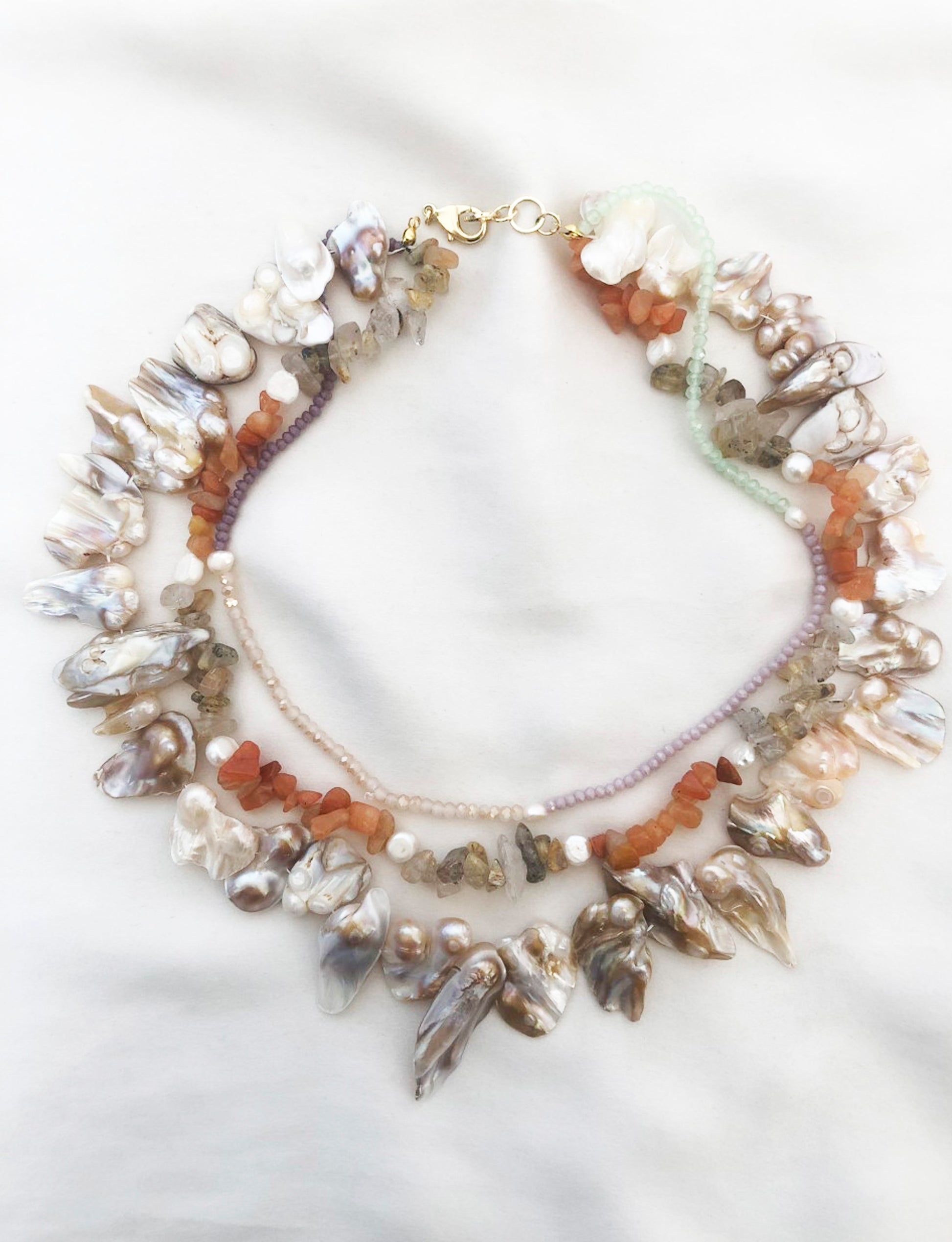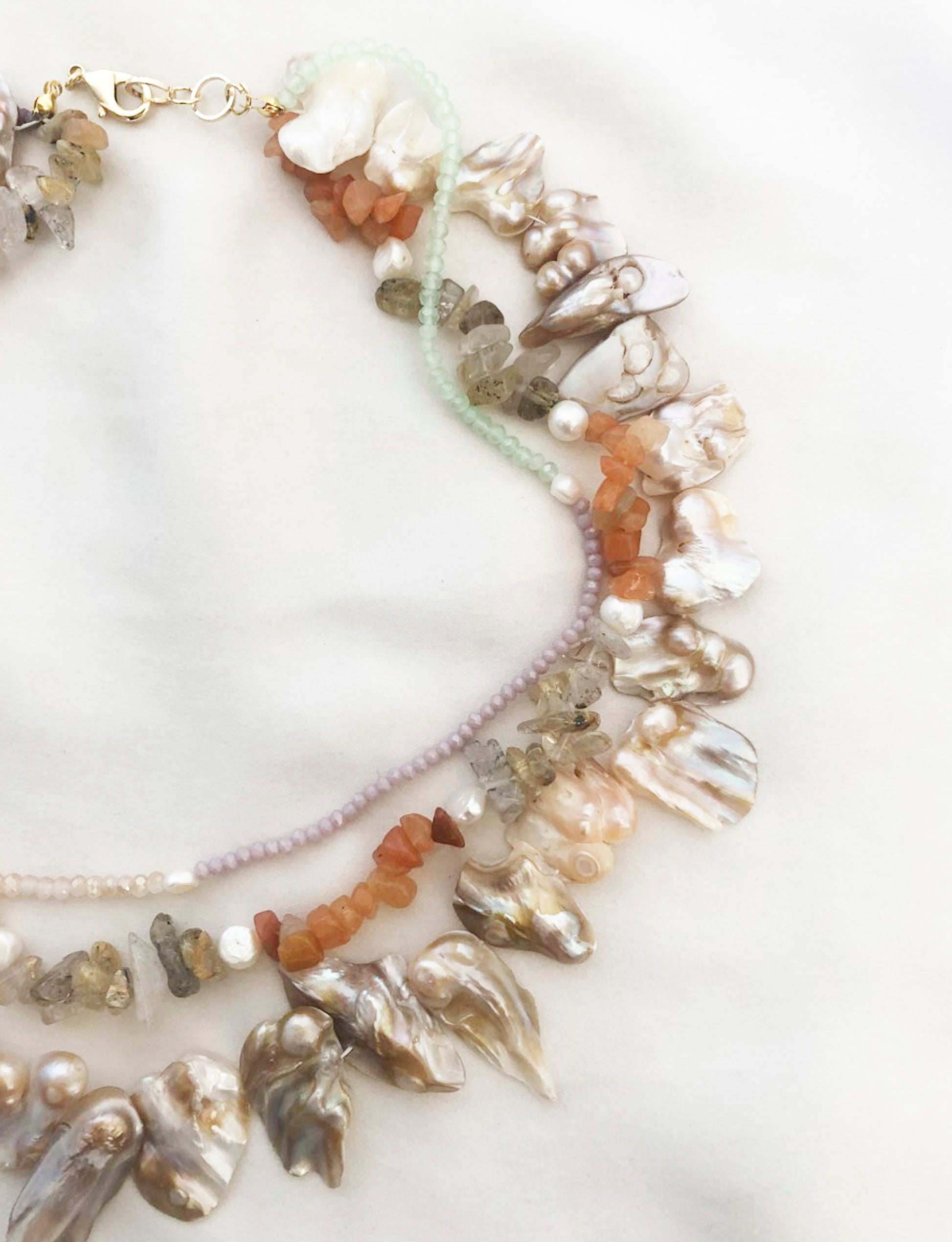 Collar triple vueltas. Baño de oro, perlas de río irregulares naturales, conchas de perlas, cristales y piedras naturales. Hecho a mano. Diseño exclusivo.