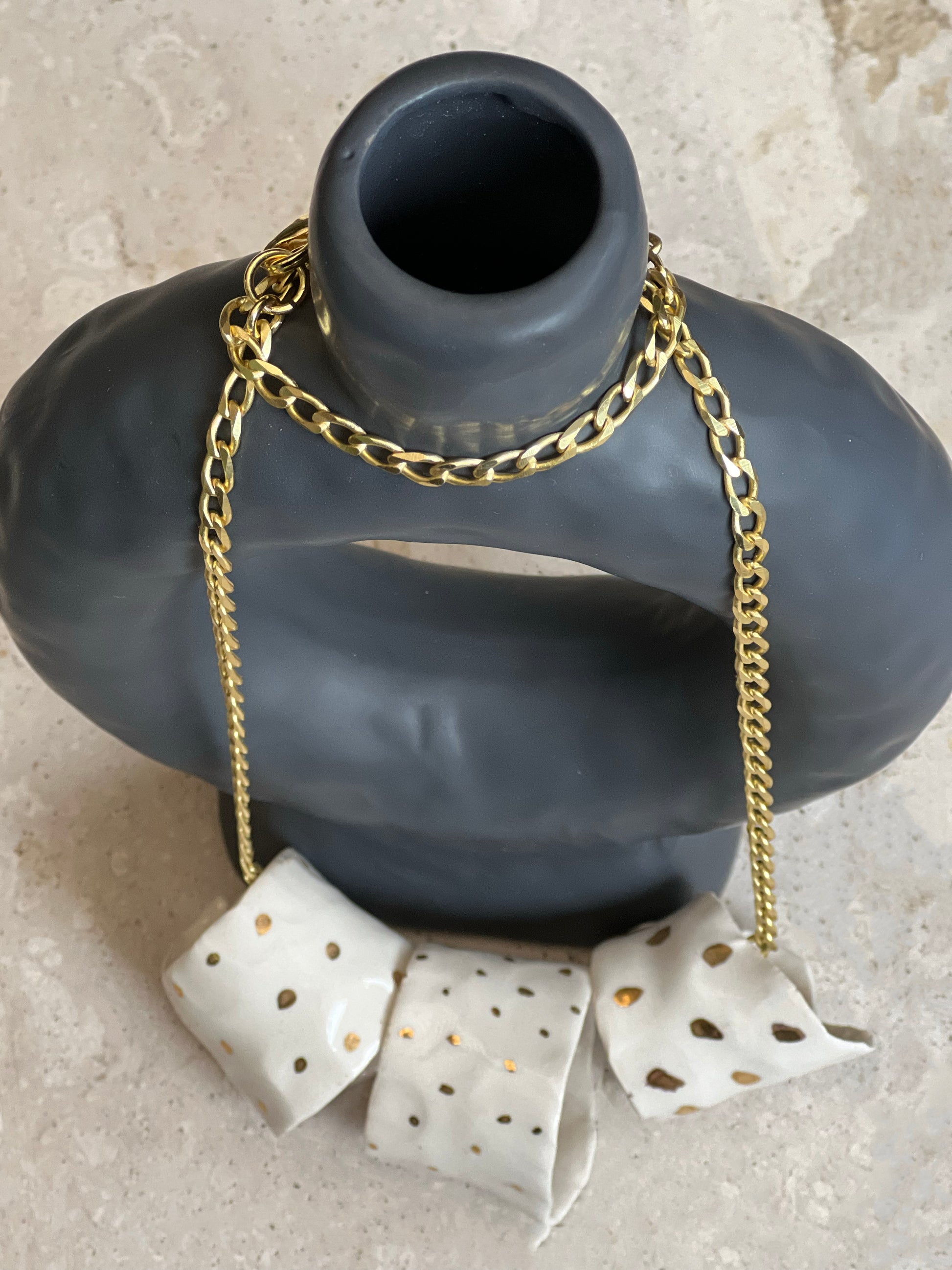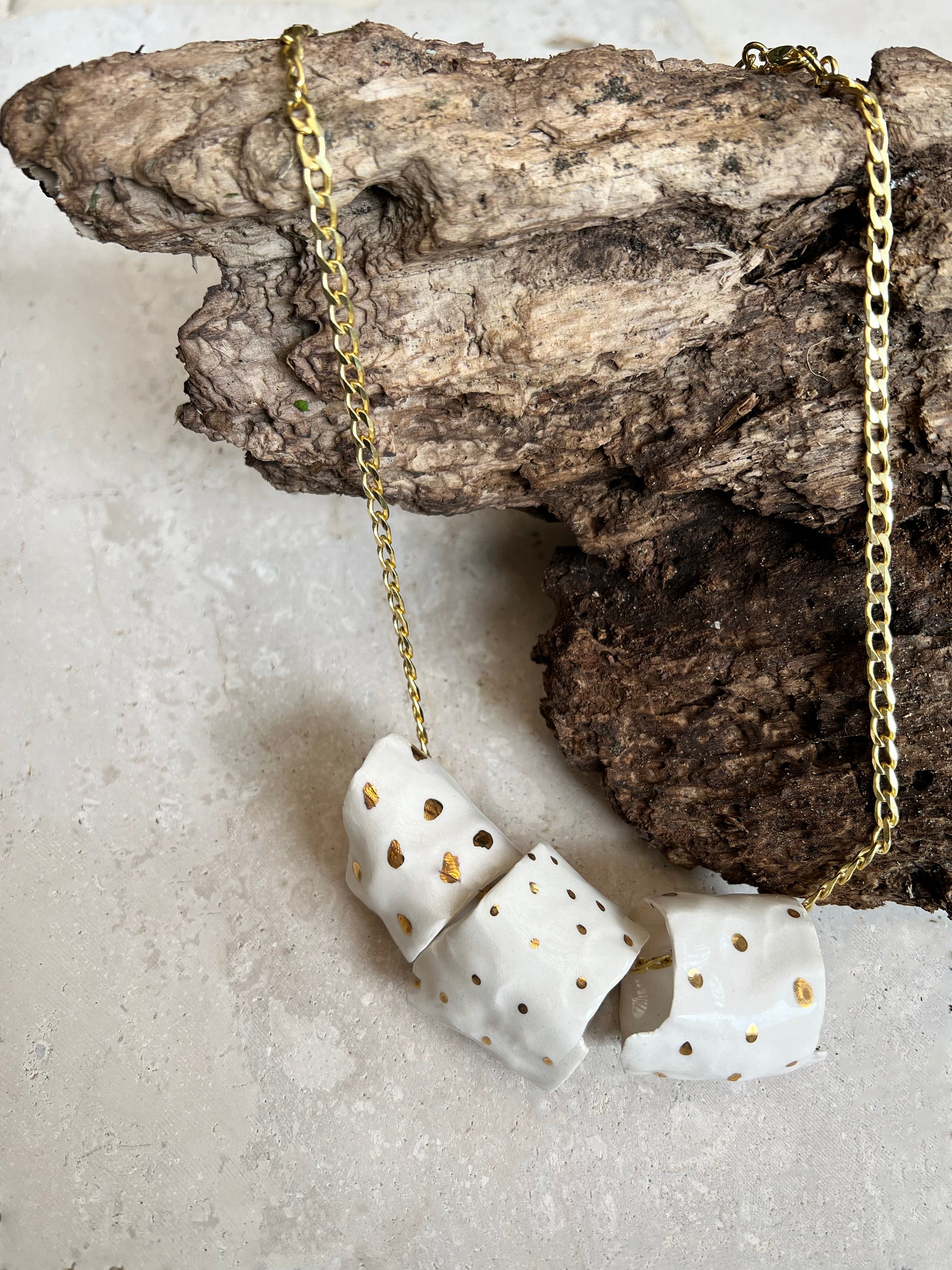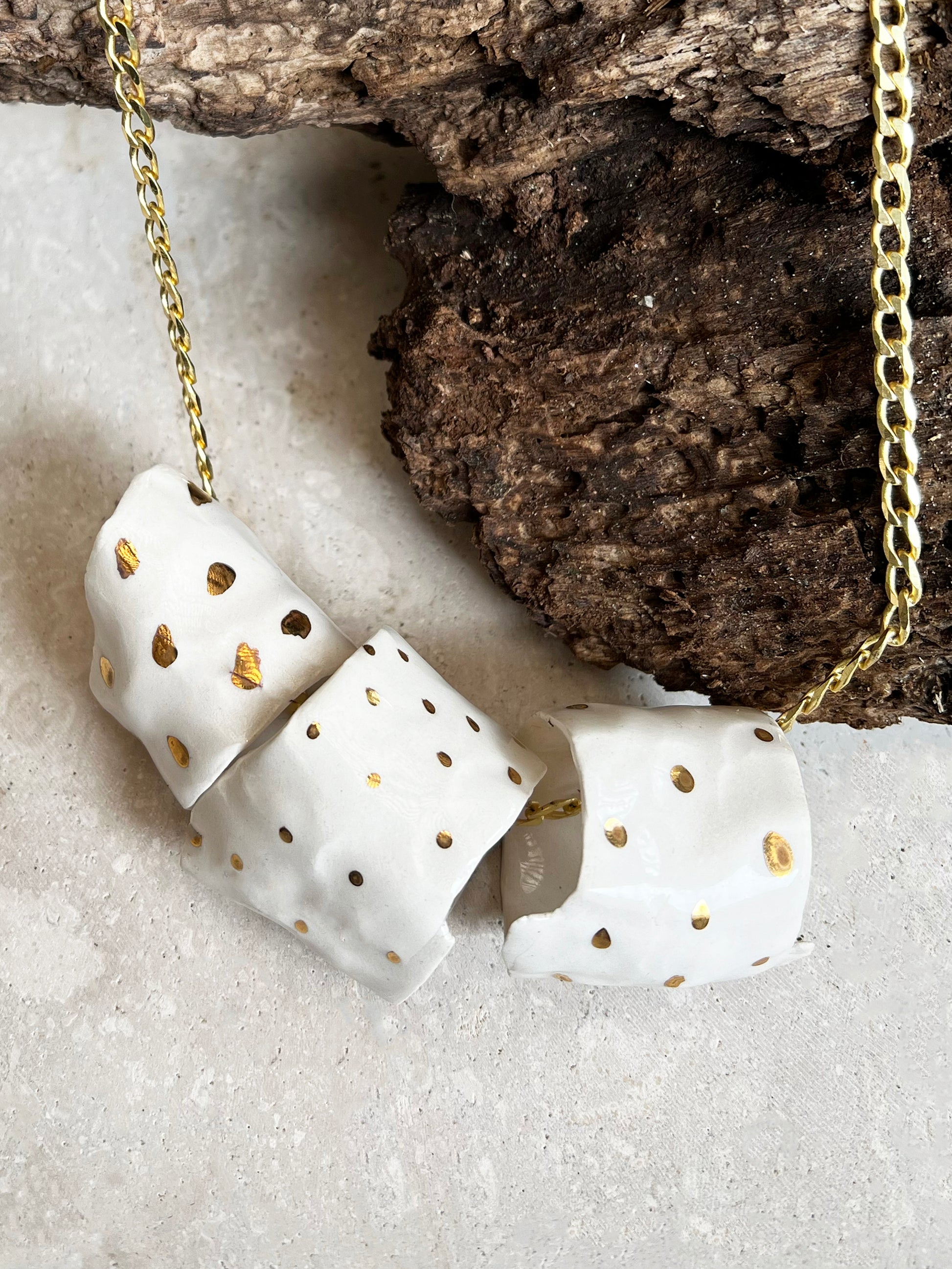 COLLAR DE PORCELANA PINTADO CON ORO HECHO A MANO. DISEÑO EXCLUSIVO. CADENA ENCHAPADA EN ORO.