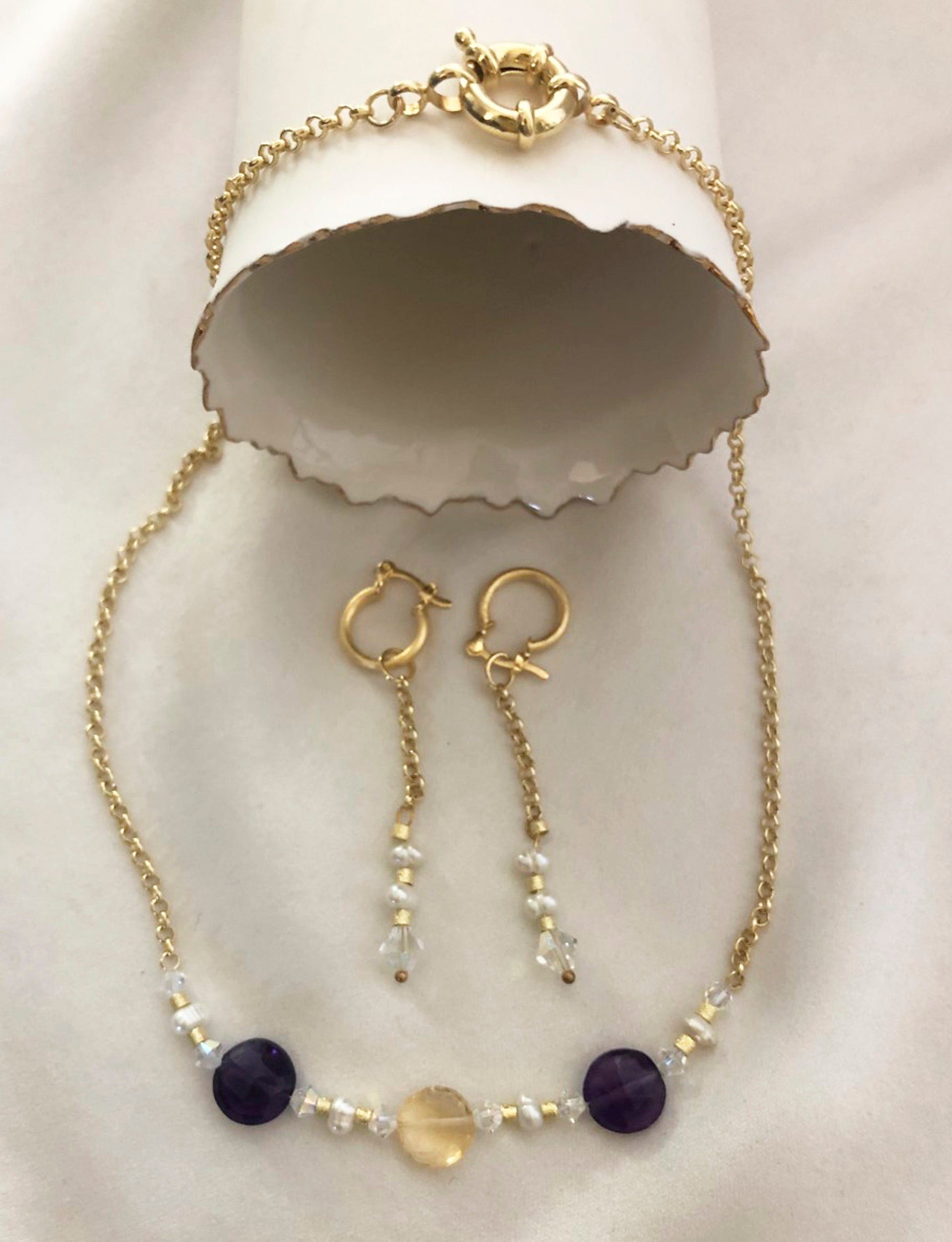 Juego de collar y aros bañados en oro con topacios y piedra citrino, perlitas de río y cristalitos Swarovski. Hechos a mano. Diseño exclusivo.